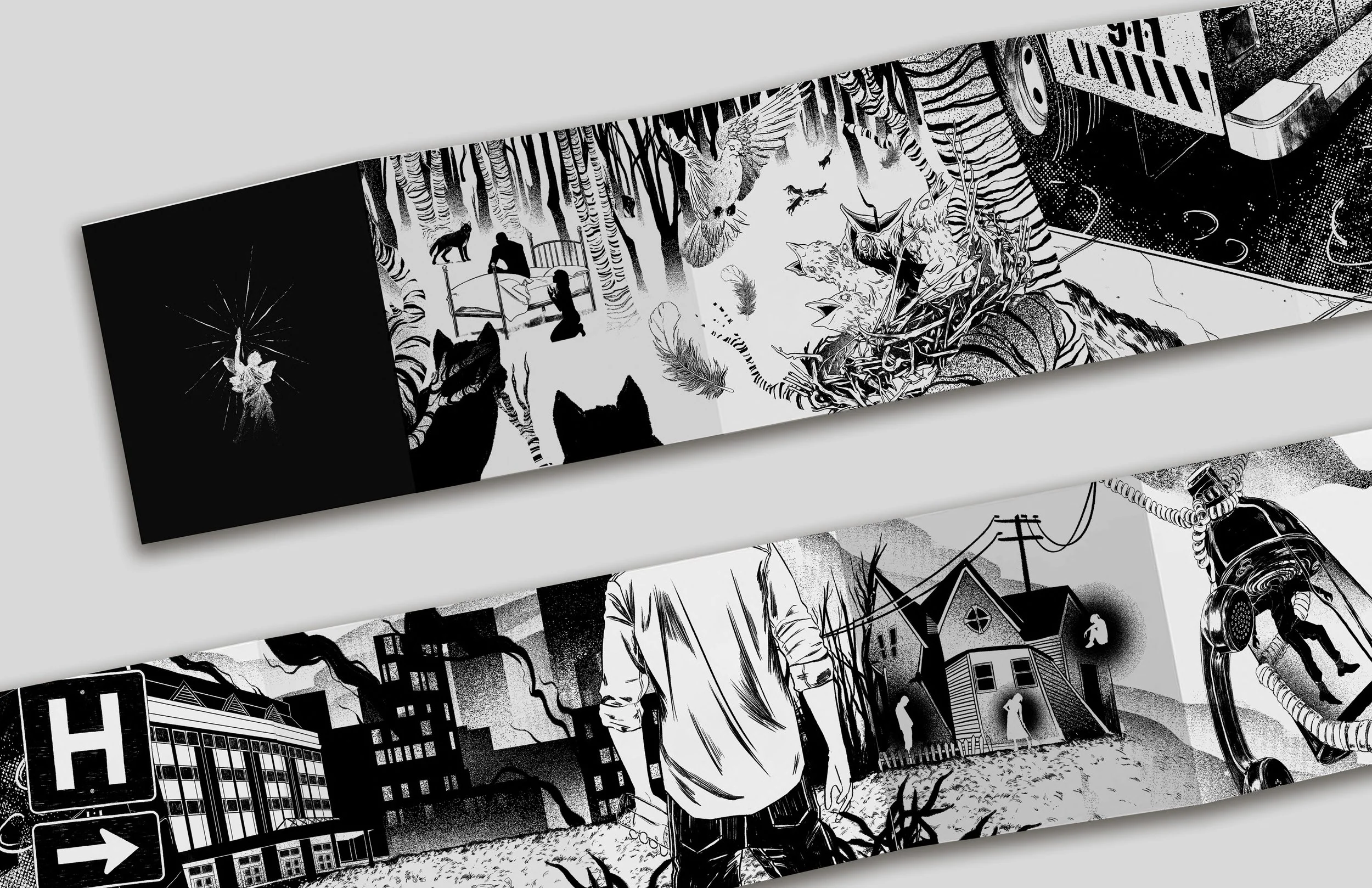 The physical copy of the album is presented as an accordion book, emphasizing the seamless transitions between each illustration. This project was printed on a single page (1ft by 14ft) and folded into an accordion book, collapsing to resemble a vinyl record sleeve.